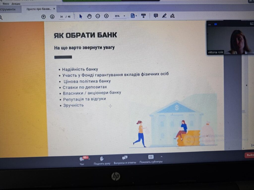 22.05.2023 року викладач спецдисциплін та здобувачі освіти групи 21-ООФ спеціальності облік і оподаткування взяли участь у вебінарі “Просто про банки та банківську систему Україниˮ від головного експерта управління зв’язків з громадськістю та фінансової обізнаності Департаменту комунікацій НБУ Вікторії Ролік.
