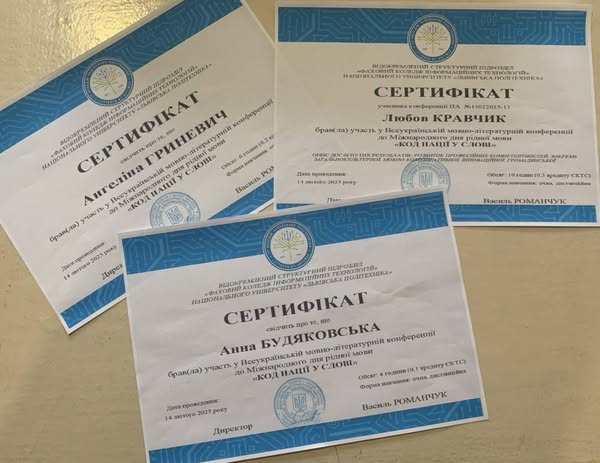 Викладач української мови і літератури Кравчик Л.М. зі здобувачами освіти 31-ОО-Ф групи взяли участь у Всеукраїнській мовно-літературній конференції до Міжнародного дня рідної мови “Код нації у слові”, проведену ВСП “Фаховий коледж інформаційних технологій Національного університету “Львівська політехніка”