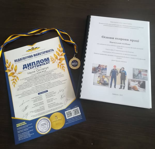 Остапук Неля Григорівна, викладач спецдисциплін, посіла I місце у Національному (Всеукраїнському відкритому) конкурсі педагогічної майстерності в номінації “Навчальний посібник”, приставивши роботу “Основи охорони праці”: навчальний посібник для здобувачів освіти освітньо-професійного ступеня фаховий молодший бакалавр, галузь знань 19 “Архітектура та будівництво, спеціальність 192 “Будівництво та цивільна інженерія” ОПП “Опорядженя будівель і споруд та будівельний дизайн” денної форми навчання.