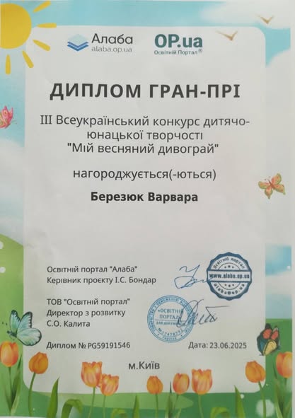 Вітаємо Варвару Березюк, здобувачку освіти 2-го курсу із здобуттям найвищої нагороди (ГРАН-ПРІ) у ІІІ Всеукраїнському конкурсі дитячо-юнацької творчості “Мій весняний дивограй” у номінації “Малюнок”. Керівник Остапук Н. Г.