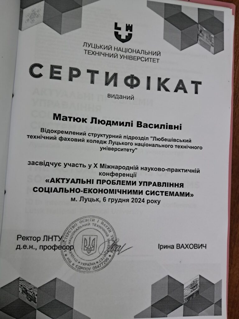 Заступник директора НВР Людмила Матюк взяла участь у Х Міжнародній науково-практичній конференції “Актуальні проблеми управління соціально-економічними системами”, яка відбулась на базі Луцького національного технічного університету.