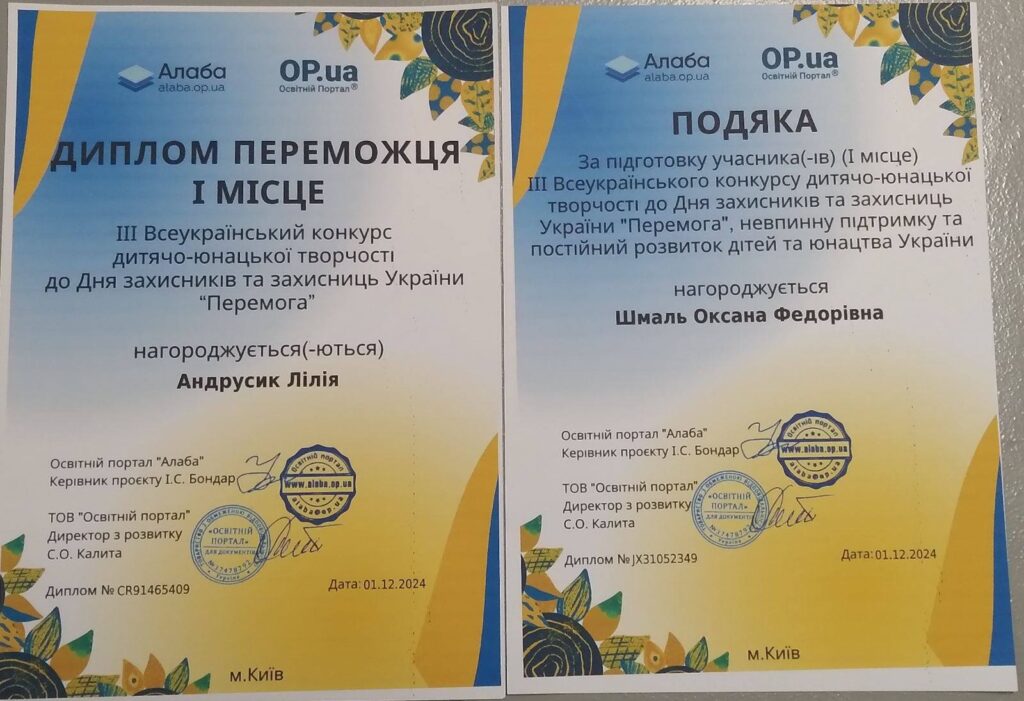 Вітаємо Лілію Андрусик, студентку першого курсу спеціальності “Будівництво та цивільна інженерія”, за зайняте І місце у номінації малюнок у ІІІ Всеукраїнському конкурсі дитячо-юнацької творчості до Дня Захисників та Захисниць України “Перемога” (керівник Оксана Шмаль).