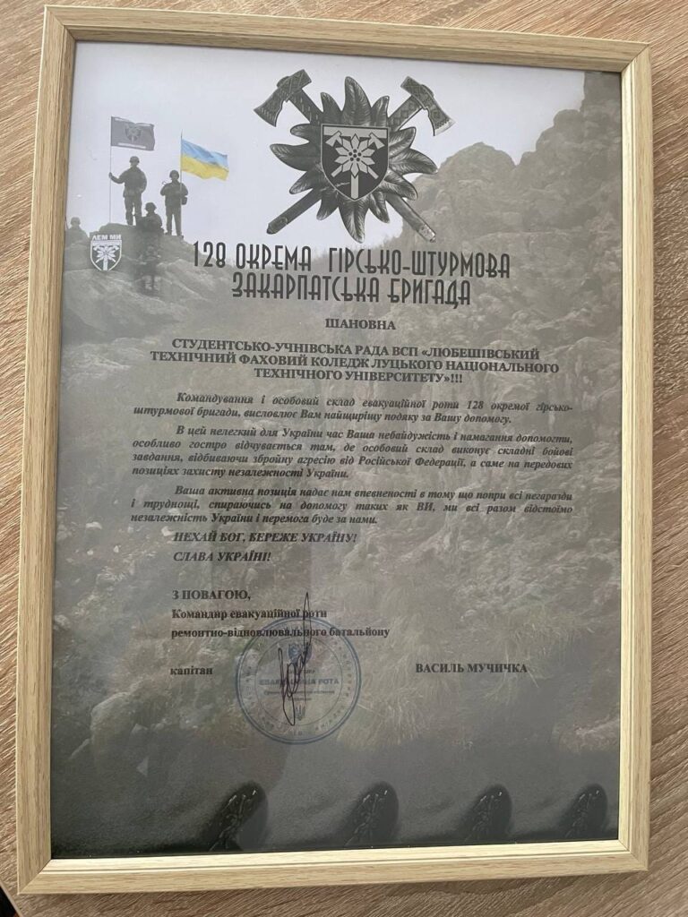 Студентсько-учнівська рада ВСП “Любешівський технічний фаховий коледж ЛНТУ” отримала подяку від командування і особового складу 128 окремої гірсько-штурмової бригади, за активну позицію, допомогу та підтримку, наближення перемоги.