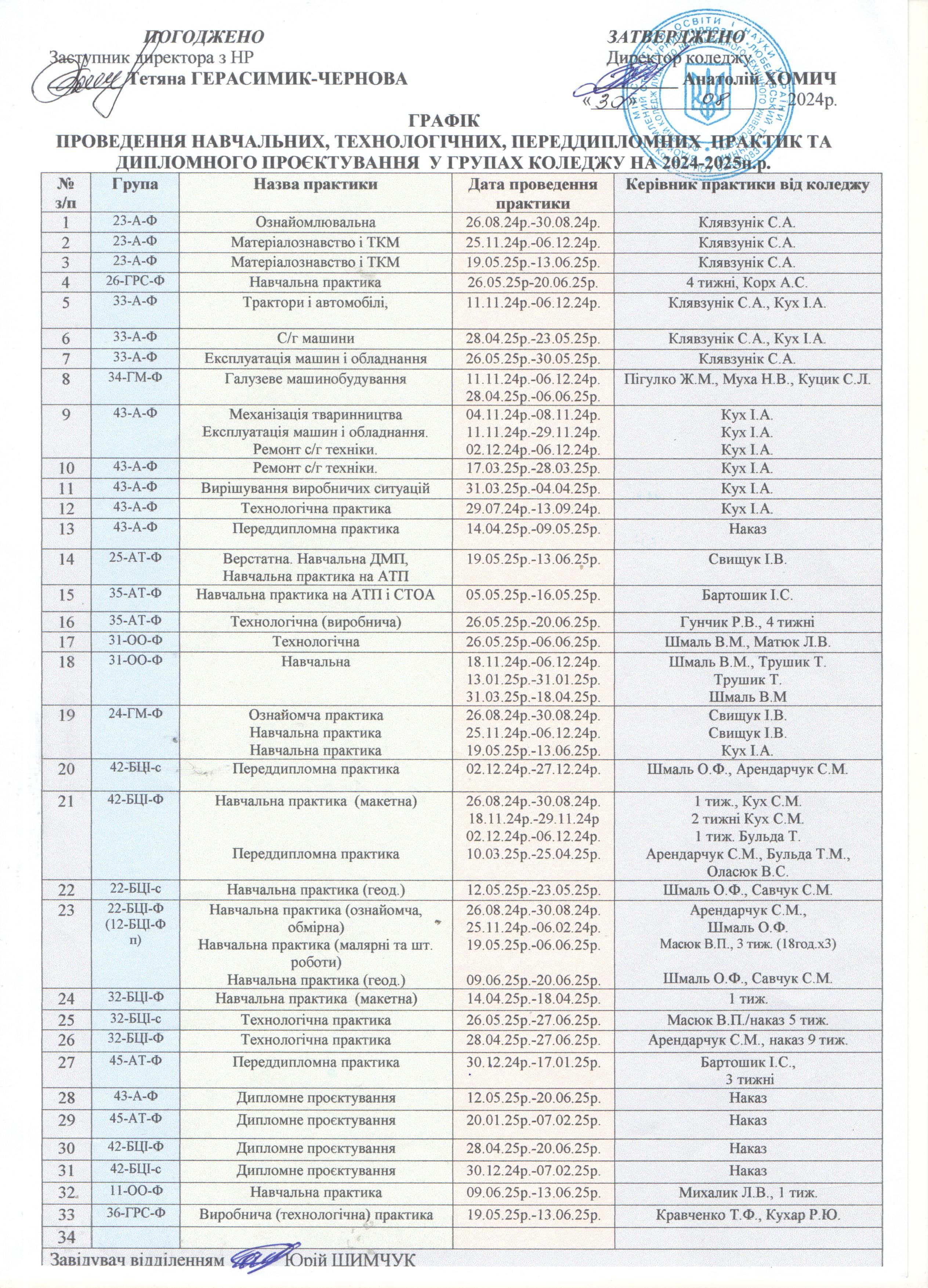 Графік проведення навчальних, технологічних, переддипломних практик та дп у групах коледжу