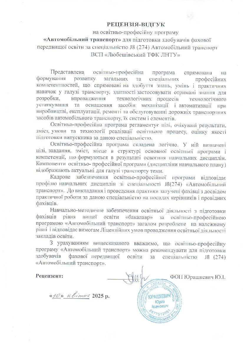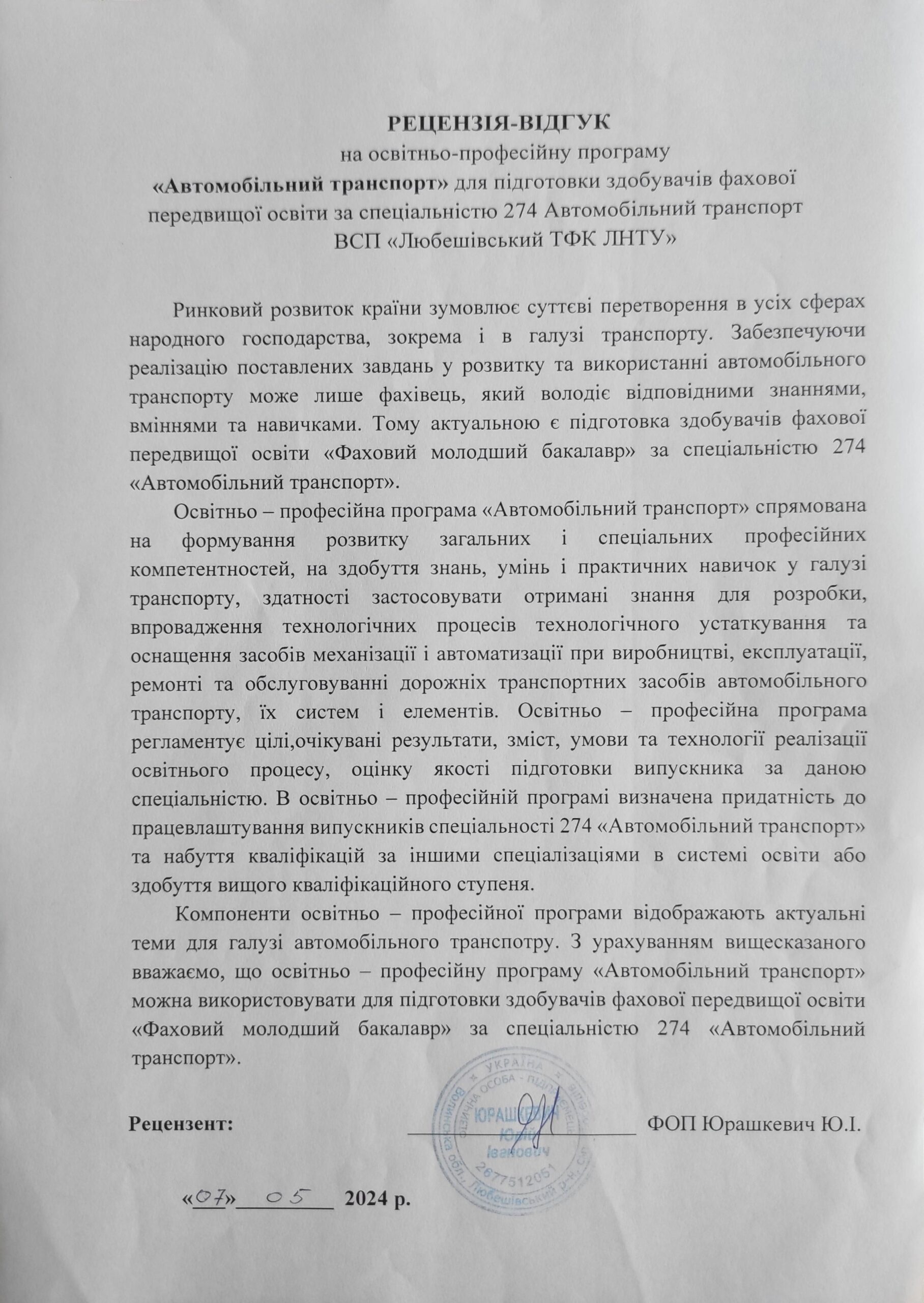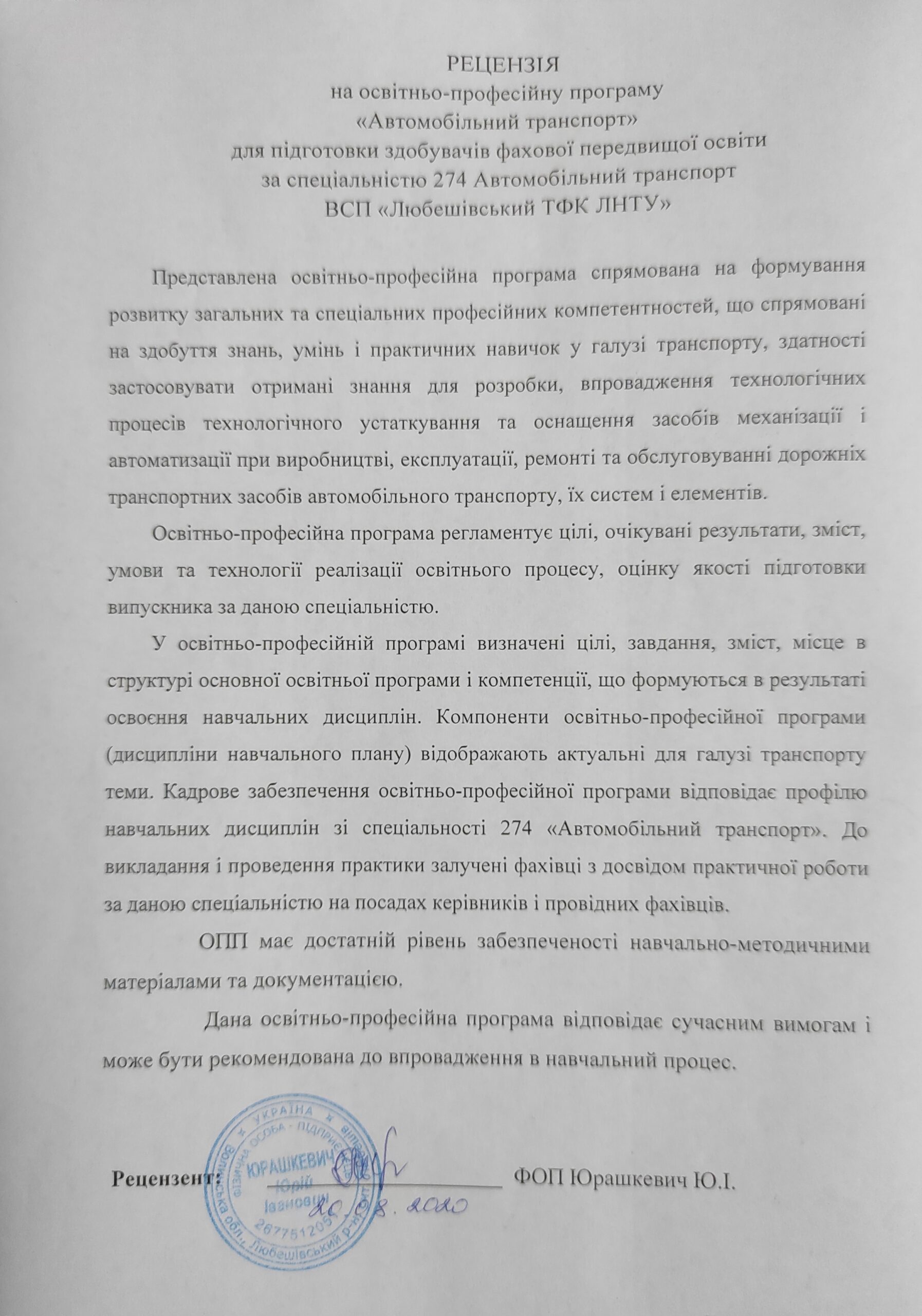 Рецензія-відгук на освітньо-професійну програму (ФОП Юрашкевич Ю.І.)