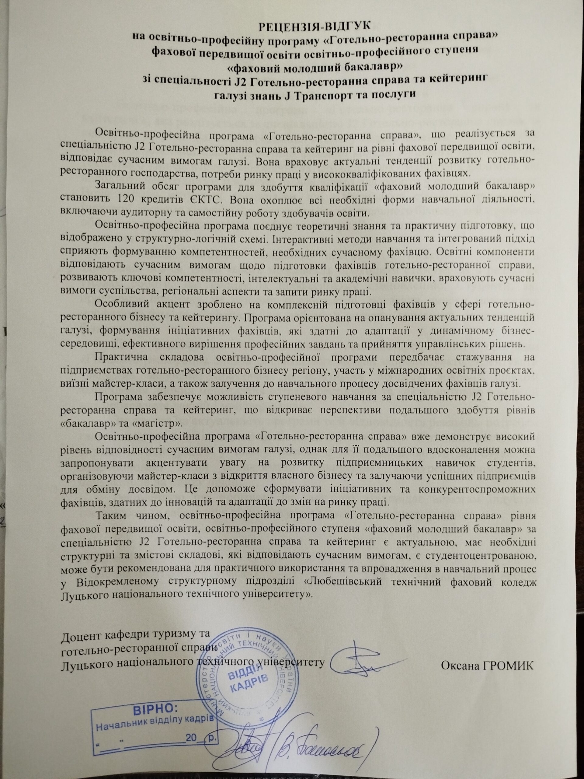 Рецензія-відгук на освітньо-професійну програму (д.к.т. та г-р.с. Оксана Громик)