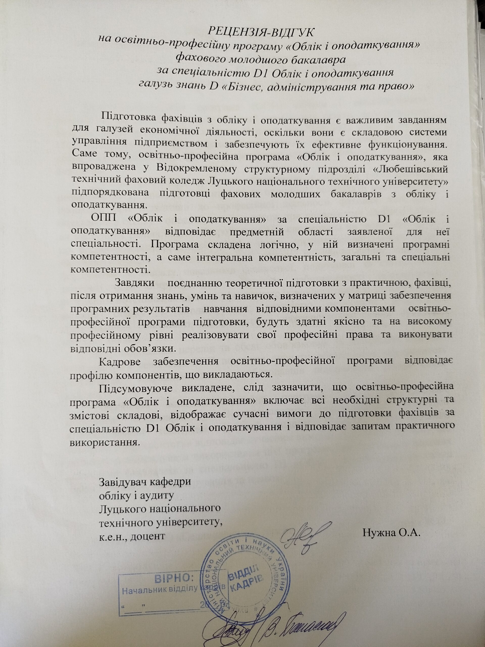 Рецензія-відгук на освітньо-професійну програму (к.е.н., доцент О.А. Нужна)