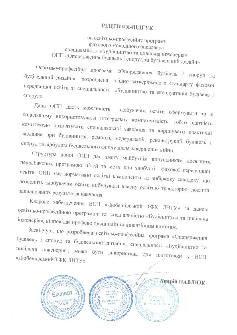 Рецензія-відгук на освітньо-професійну програму (експерта з держнагляду А.В. Павлюк)