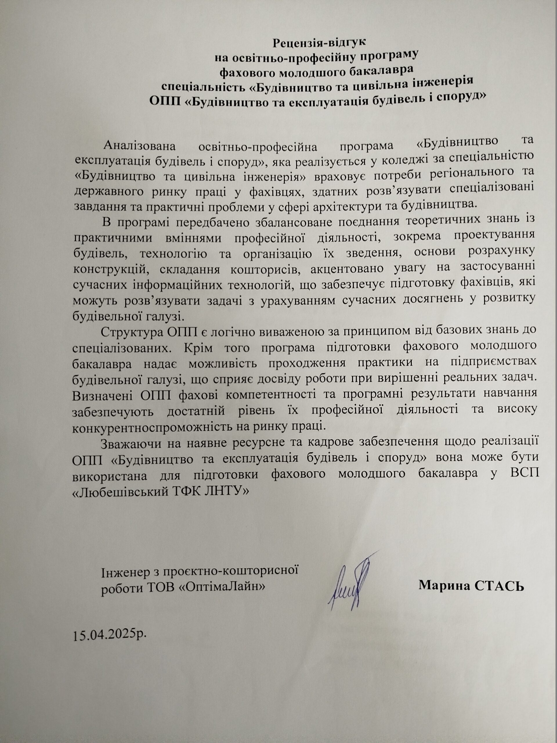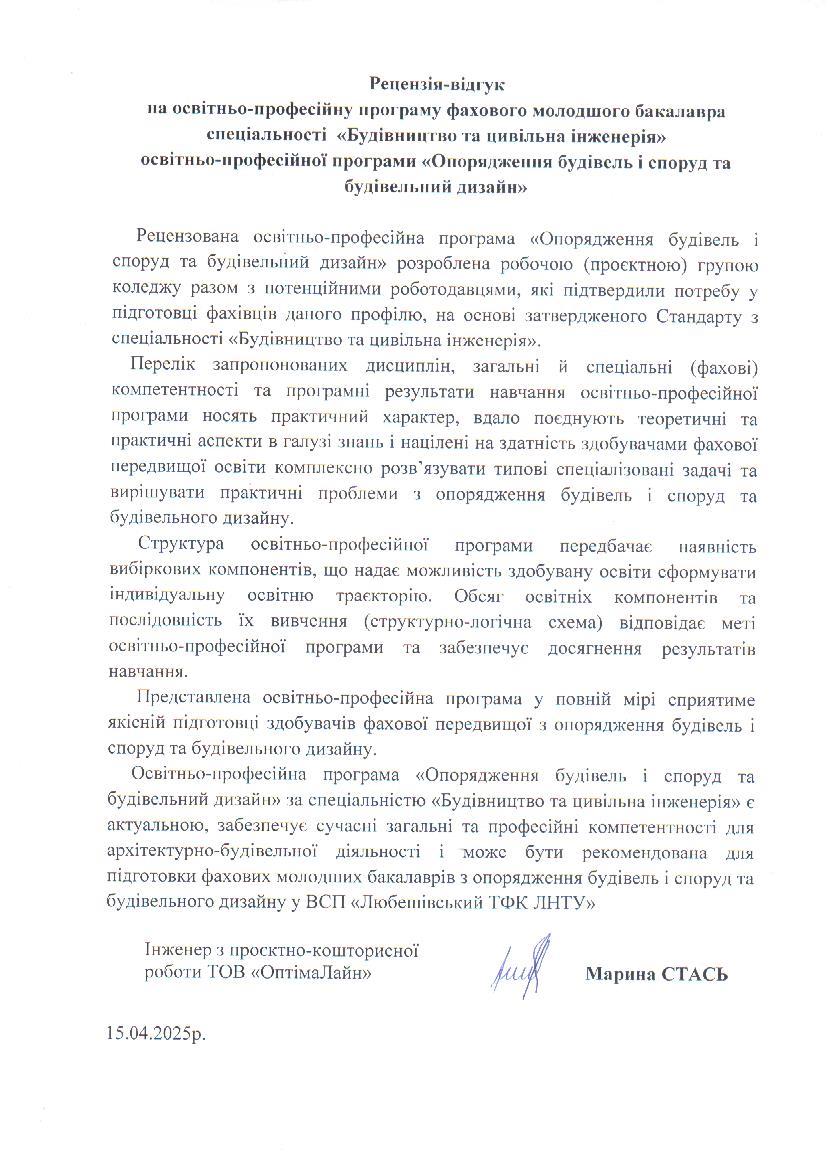 Рецензія-відгук на освітньо-професійну програму (ТОВ “ОптімаЛайн”)