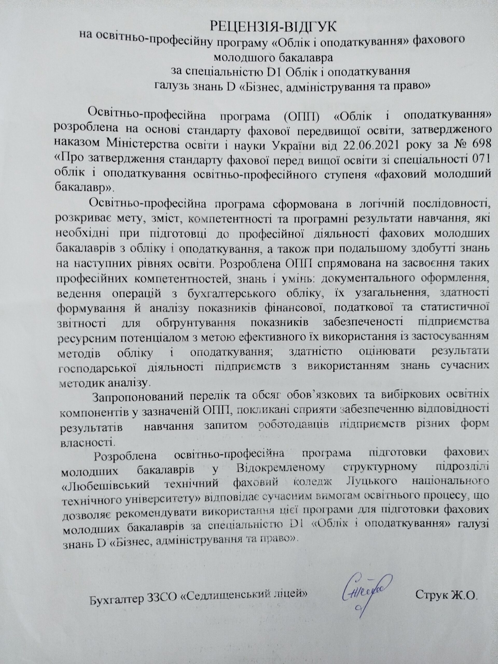 Рецензія-відгук на освітньо-професійну програму (ЗЗСО “Седлищенський ліцей”)