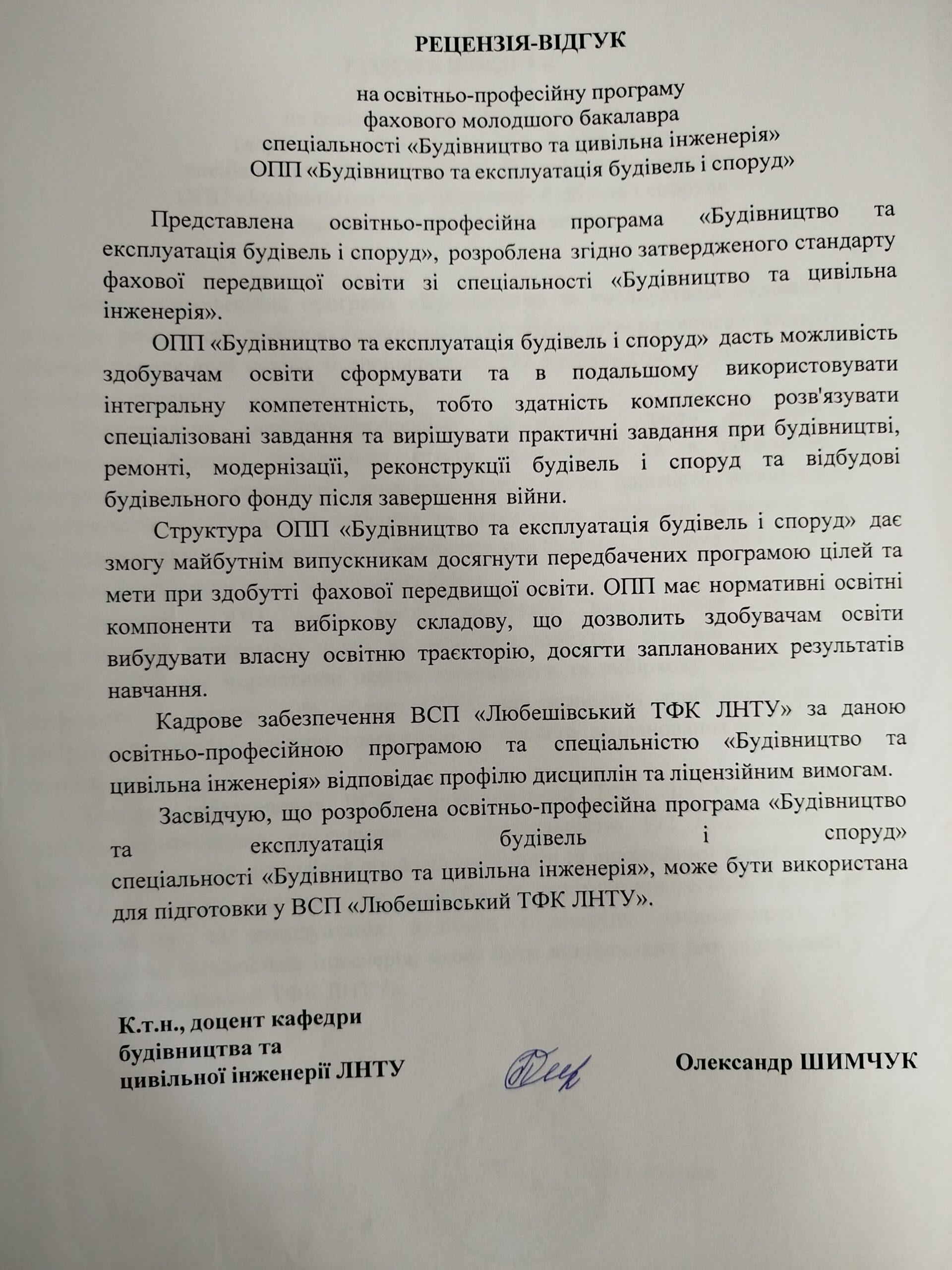 Рецензія-відгук на освітньо-професійну програму (к.т.н. О.П. Шимчука)