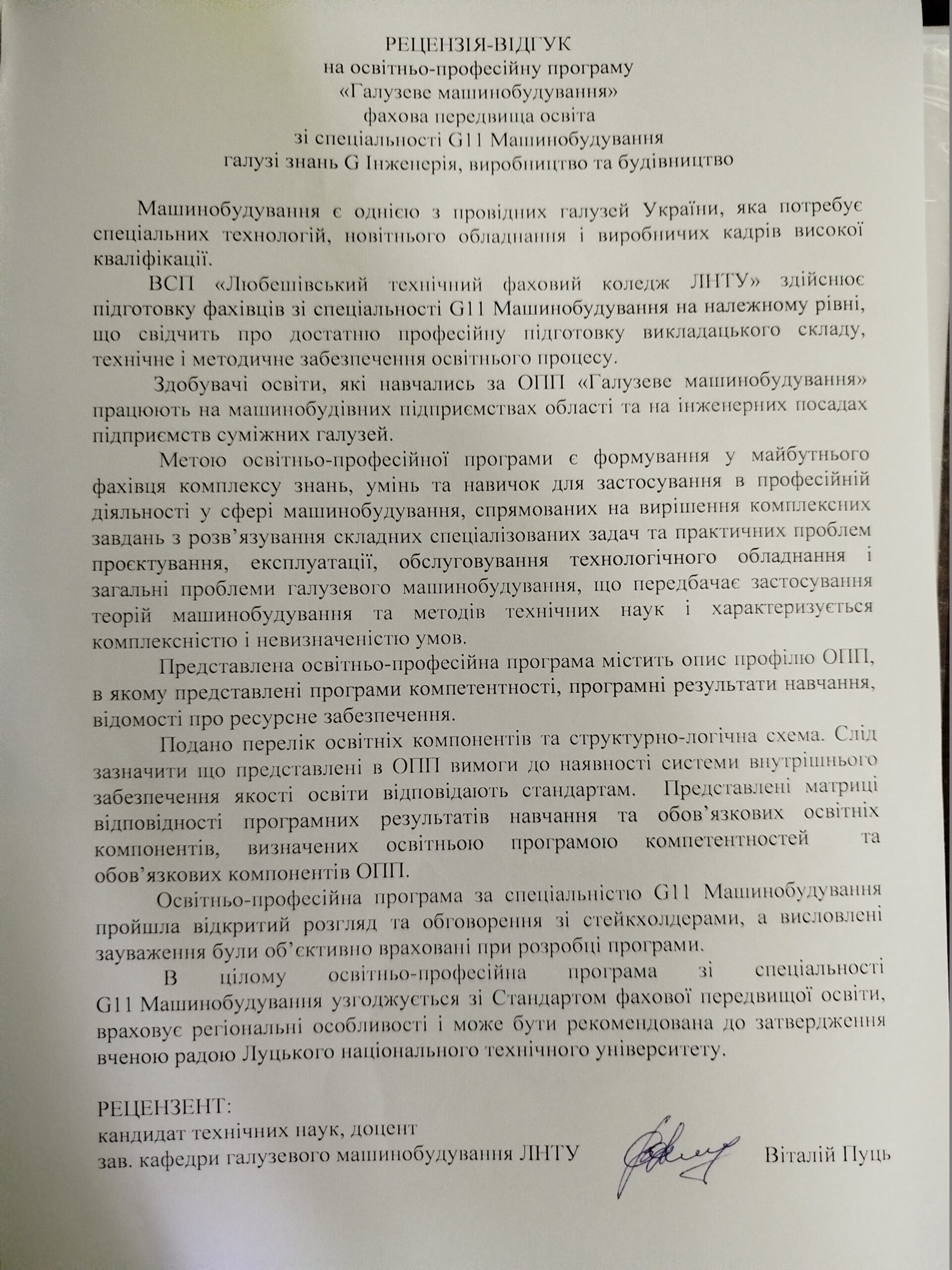 Рецензія-відгук на освітньо-професійну програму (к.т.н. Віталій Пуць)