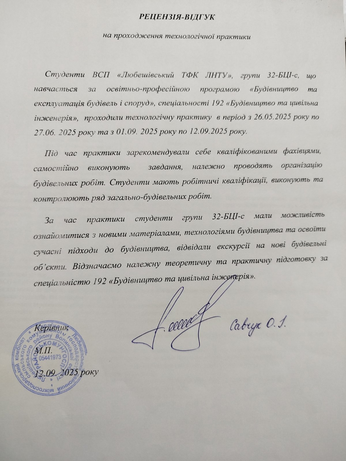 Рецензія-відгук на проходження технологічної практики (“Райсількомунгосп” Савчук О.І.)