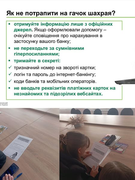 В рамках Тижня безпечного Інтернету від Національного банку України практичним психологом із здобувачами освіти груп: 11 та 26 проведено заняття на тему: “Поради з кіпербезпеки та схеми шахрайства у воєнний час”. На занятті здобувачі освіти поліпшили свої знання з кіпербезпеки та поговорили про: