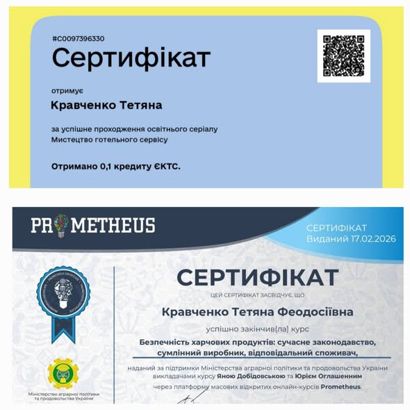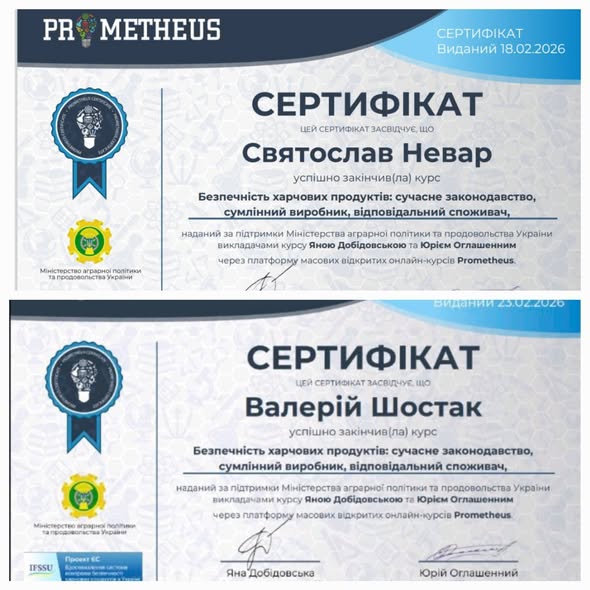 Студенти пройшли онлайн-курс на платформі Prometheus “Безпечність харчових продуктів: сучасне законодавство, сумлінний виробник, відповідальний споживач” та отримали сертифікати.
