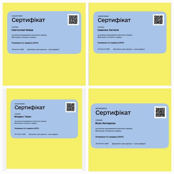 Також здобувачі успішно опанували освітній серіал “Мистецтво готельного бізнесу”, де здобули практичні знання щодо контролю якості готельних послуг та ефективної комунікації з гостями.