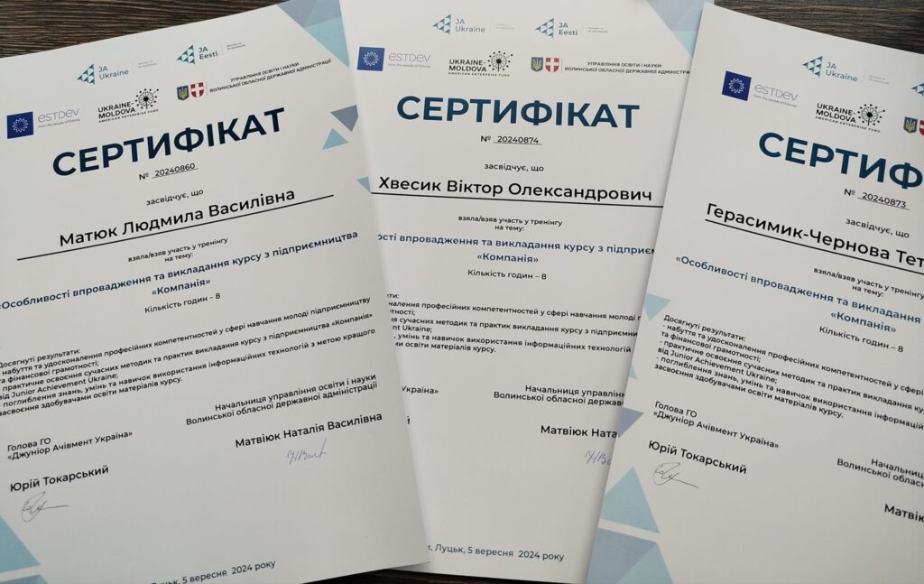 В рамках проекту JA Ukraine навчальної програми “Компанія” для педагогів ПТО Волині у м. Луцьку 05 вересня відбувся тренінг з впровадження програми “Компанія”. Участь у заході взяли викладачі коледжу – Людмила Матюк, Тетяна Герасимик-Чернова, Віктор Хвесик. Вони отримали практичні знання щодо подальшого впровадження навчальної програми ” Компанія” та створення міні-компаній.