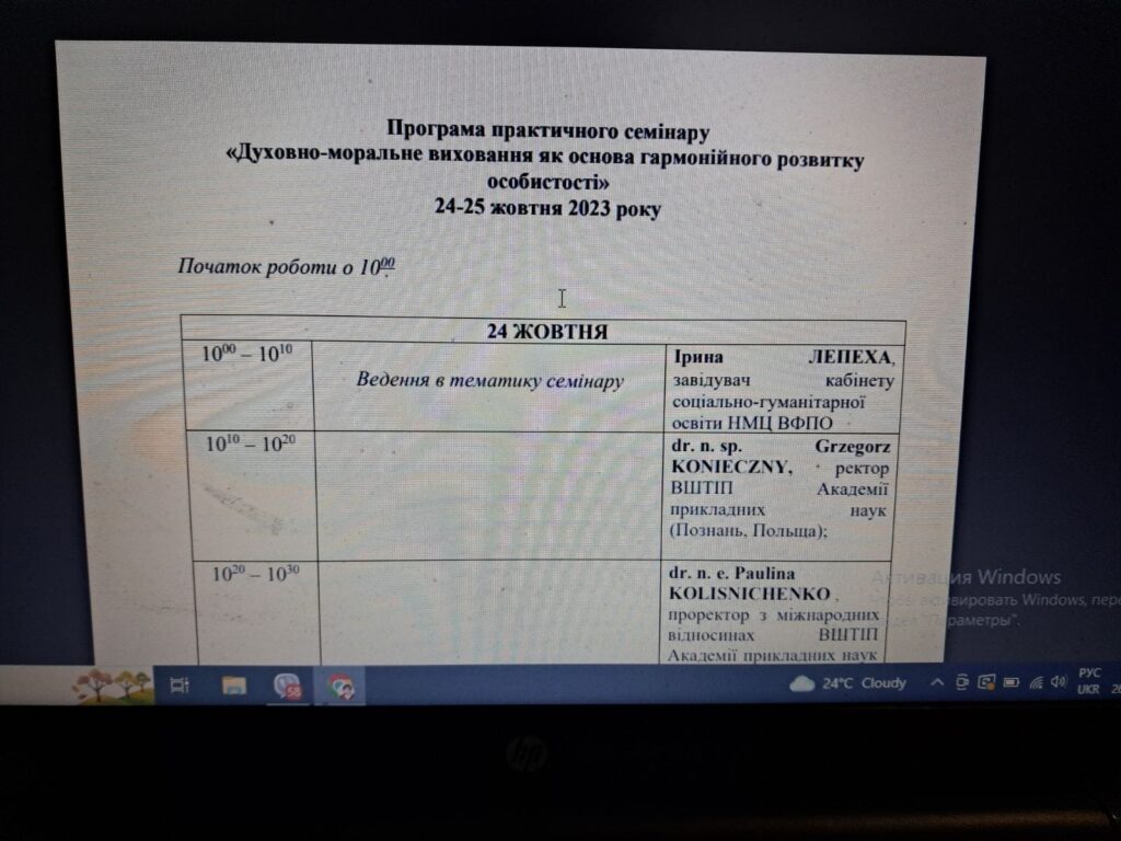 Заступник директора з навчально-виховної роботи Людмила МАТЮК, 24-25 жовтня, брала участь у практичному семінарі “Духовно-моральне виховання як основа гармонійного розвитку особистості” на базі НМЦ ВФПО.