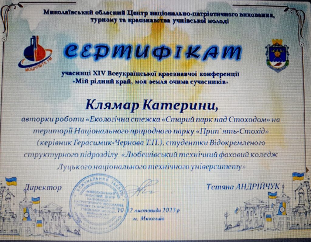 Студентка ІІІ курсу, спеціальності 192 Будівництво та цивільна інженкрія, учасниця ХІV Всеукраїнської краєзнавчої конференції учнівської молоді “Мій рідний край, моя земля очима сучасників”, яку організував онлайн Миколаївський обласний Центр націанально-патріотичного виховання, туризму та краєзнавства учнівської молоді Миколаївської обласної ради.