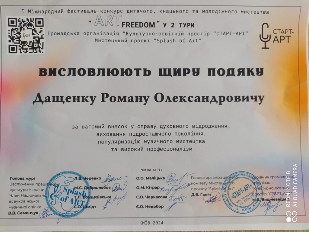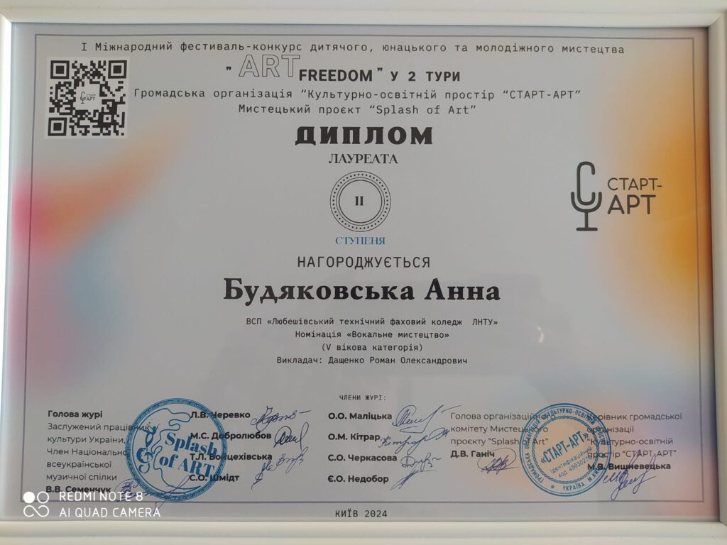 Вітаємо студентку Анну Будяковську та керівника Романа Дащенка з перемогою у І Міжнародному фестивалі-конкурсі дитячого, юнацького та молодіжного мистецтва “ART FREEDOM”.