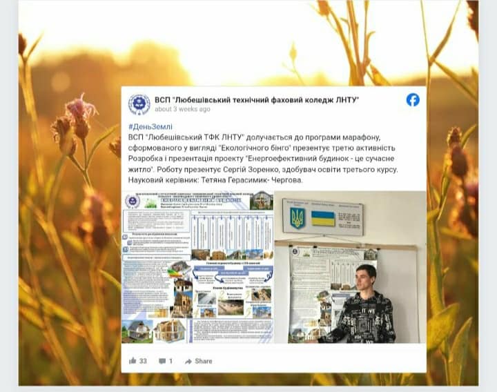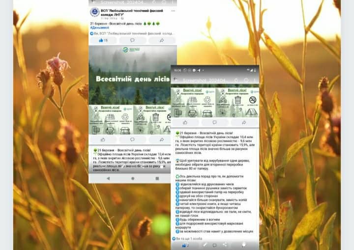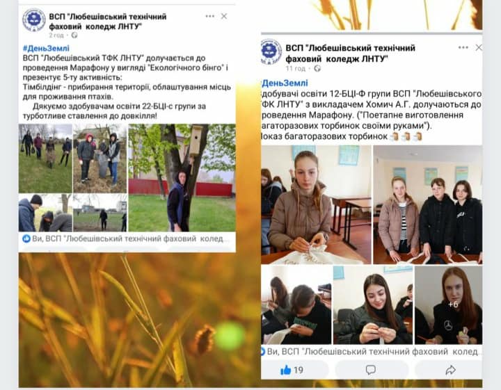 22 квітня викладач ВСП “Любешівський ТФК ЛНТУ” Бущук В.Я. взяла участь в обласному природничому марафоні, презентувавши екологічні заходи, висвітлені на сторінці навчального закладу активності, присвячені Міжнародному дню Землі.