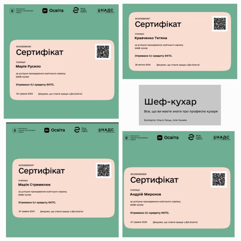 Здобувачі освіти першого року навчання спеціальності 241 Готельно-ресторанна справа 26-ГРС-Ф групи: Марія Стремелюк, Андрій Миронов і Марія Русило долучилися до неформальної освіти на платформі Дія.Освіта. В рамках навчальної дисципліни «Технології продукції ресторанного господарства» вони підвищили рівень професійних компетентностей успішно пройшовши освітній серіал «Шеф-кухар» і одержали сертифікати. Разом зі студентами в заході взяла участь викладач Тетяна Кравченко.