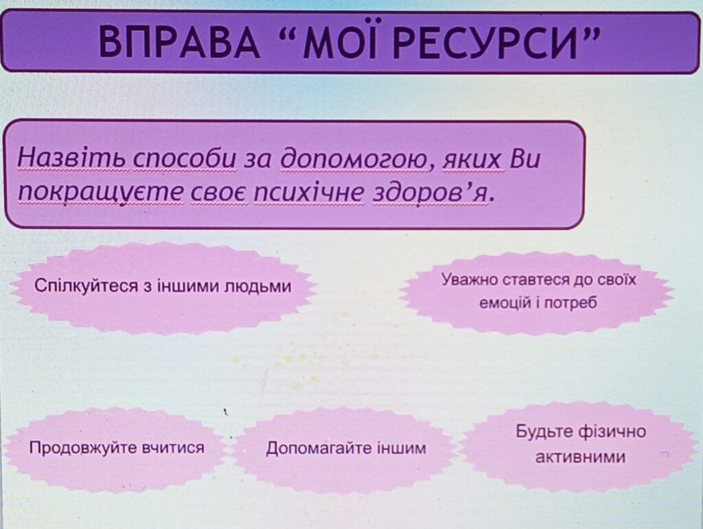 10 жовтня у Всесвітній день психічного здоров’я практичним психологом Наталією Лопухович проведено захід з учасниками психологічного клубу з метою підвищення рівня психологічної культури, визначення шляхів і умов збереження психічного здоров’я, ознайомлення з вправами саморегуляції, розвитку творчої активності, формування навичок спілкування, а також формування позитиву на здоровий спосіб життя.