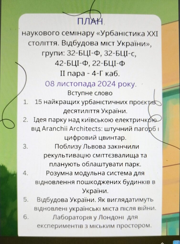 Здобувачі освіти разом з викладачами підготовили цікаві факти та новини щодо урбаністичних проєктів, можливостей покращити планування наших міст та життя в них. Поділилися досвідом інших країн, щодо розробки та реалізованих проєктів планування міського середовища. Також, розповіли про розбудову зруйнованих міст, які можуть бути наші міста після війни.