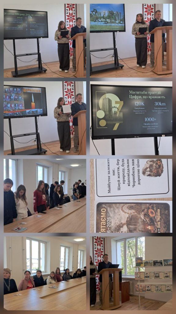 Сьогодні в коледжі для здобувачів освіти та педагогічних працівників проведено виховний захід на тему: “Чорнобиль: 40 років болю та надії”, основна мета якого— визнання мужності, самовідданості та високого професіоналізму учасників ліквідації її наслідків, увічнення пам’яті загиблих та збереження історичної правди про трагедію світового масштабу (керівник Роман ДАЩЕНКО).