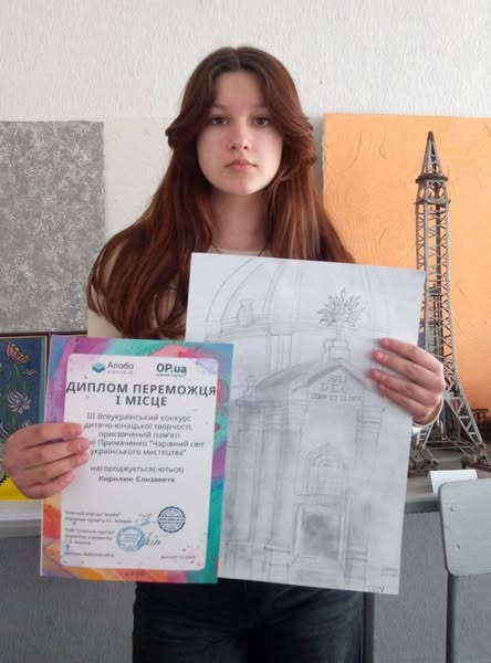 Вітаємо Кирилюк Єлизавету за зайняте І місце у ІІІ Всеукраїнському конкурсі дитячо-юнацької творчості, присвяченому пам’яті Марії Примаченко “Чарівний світ українського мистецтва” у номінації Малюнок, тема роботи “Вулиці Старого Львова”. Керівник Оксана Шмаль.