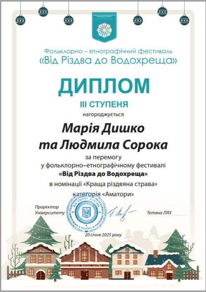 Вітаємо Марію ДИШКО, здобувачку освіти, спеціальність 241 Готельно-ресторанна справа і Людмилу СОРОКУ, здобувачку освіти, професія «Кухар, кондитер» із зайнятим ІІІ місцем у Фольклорно-етнографічному фестивалі «Від Різдва до Водохреща», у номінації «Краща різдвяна страва» (керівники: Тетяна КРАВЧЕНКО і Альона КОРХ).