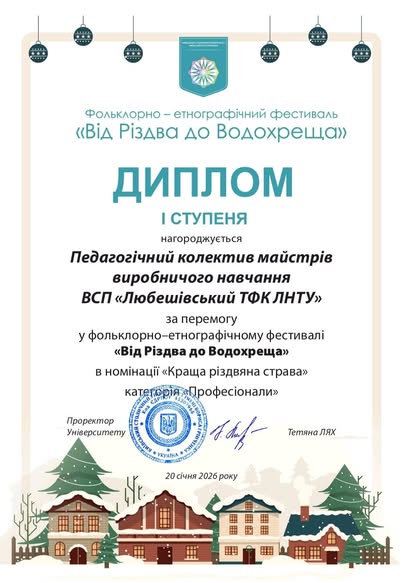 Дипломом І ступеня нагороджується педагогічний колектив майстрів виробничого навчання ВСП “Любешівський ТФК ЛНТУ” за перемогу у фольклорно-етнографічному фестивалі “Від Різдва до Водохреща” в номінації “Краща різдвяна страва”, категорія “Професіонали”.