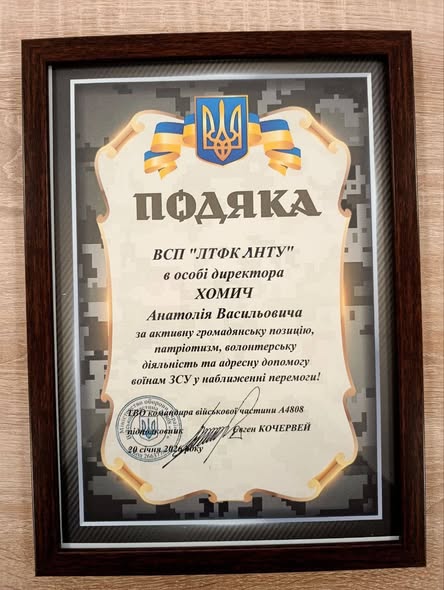 ВСП “Любешівський ТФК ЛНТУ” отримав подяку та прапор від т.в.о. командира 141 механізованої бригади за активну громадську позицію, патріотизм, волонтерську діяльність та адресну допомогу воїнам ЗСУ у наближенні перемоги