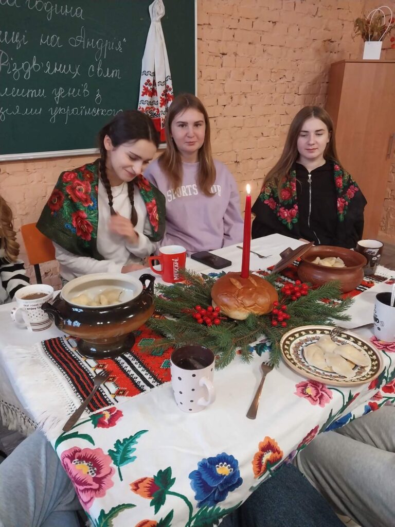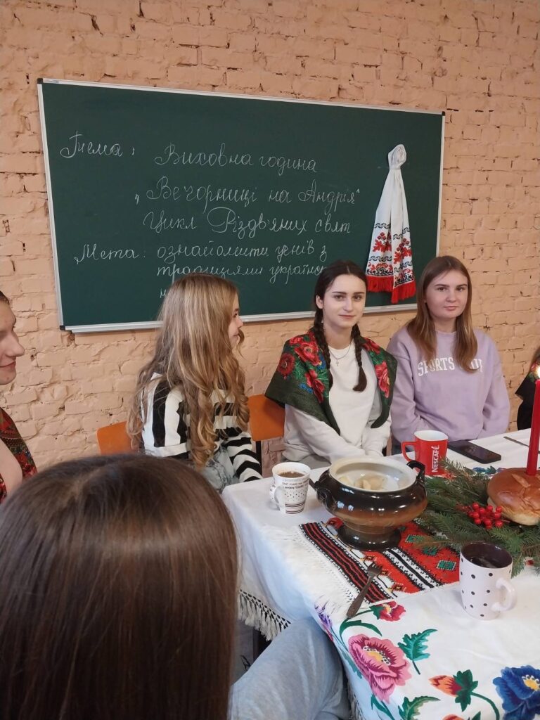 Класним керівником Світланою Мацерук та майстром виробничого навчання Жанною Пігулко проведена вихована година на тему: “Вечорниці на Андрія. Цикл Різдвяних свят”. Мета заходу: ознайомити здобувачів освіти з традиціями українського народу, виховати любов і повагу до народної творчості, розвивати інтерес до рідної землі, вчити розуміти значущість того,що створене народом.