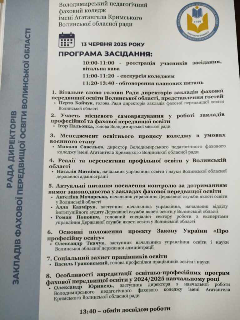 13 червня на базі Володимирського педагогічного фахового коледжу імені Агатангела Кримського відбулось спільне засідання Ради директорів та заступників директорів з навчальної роботи закладів фахової передвищої освіти. Участь у заході взяли директор коледжу Анатолій Хомич та заступник директора з НР Тетяна Герасимик-Чернова.