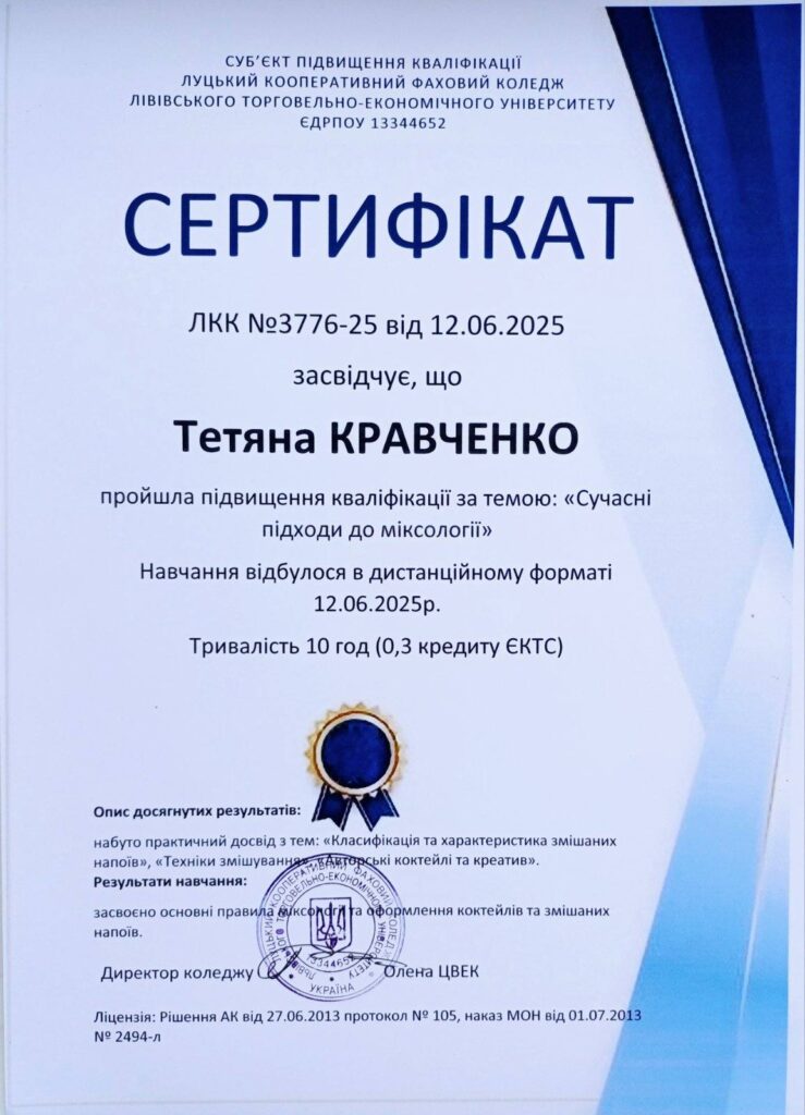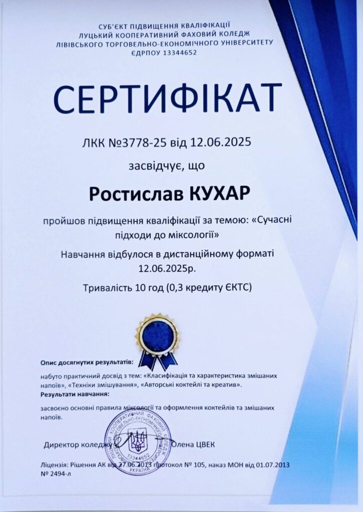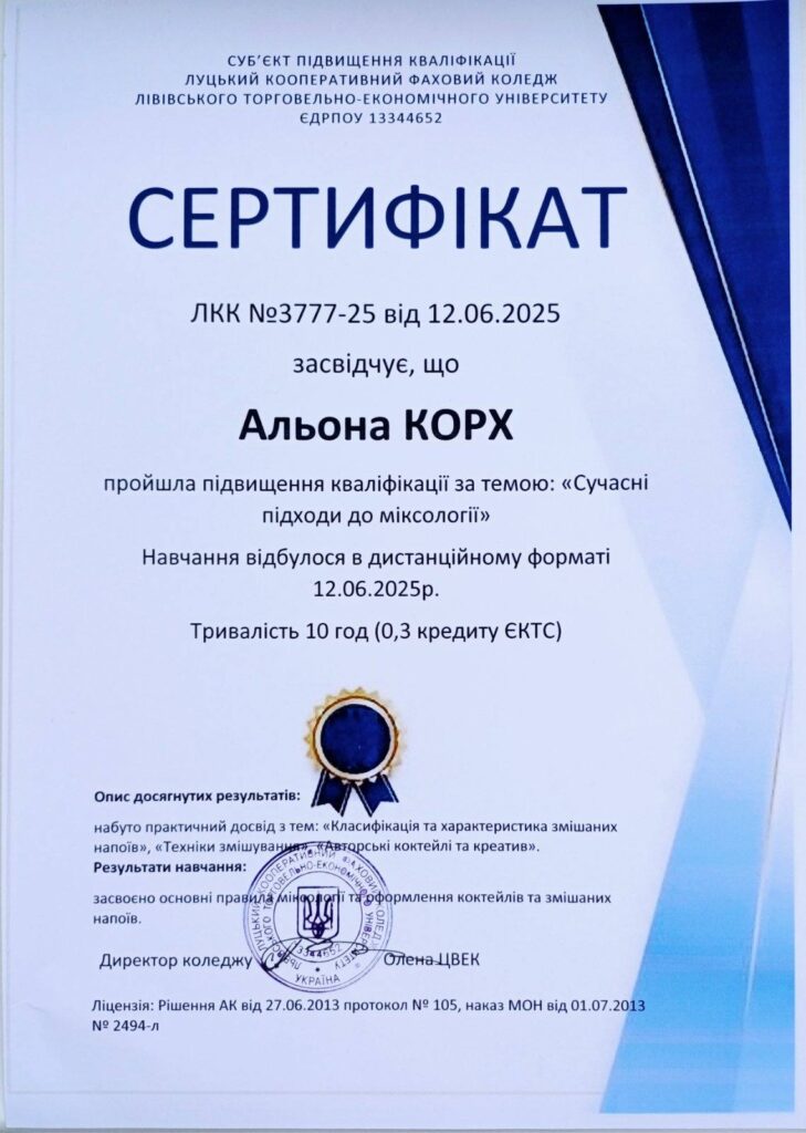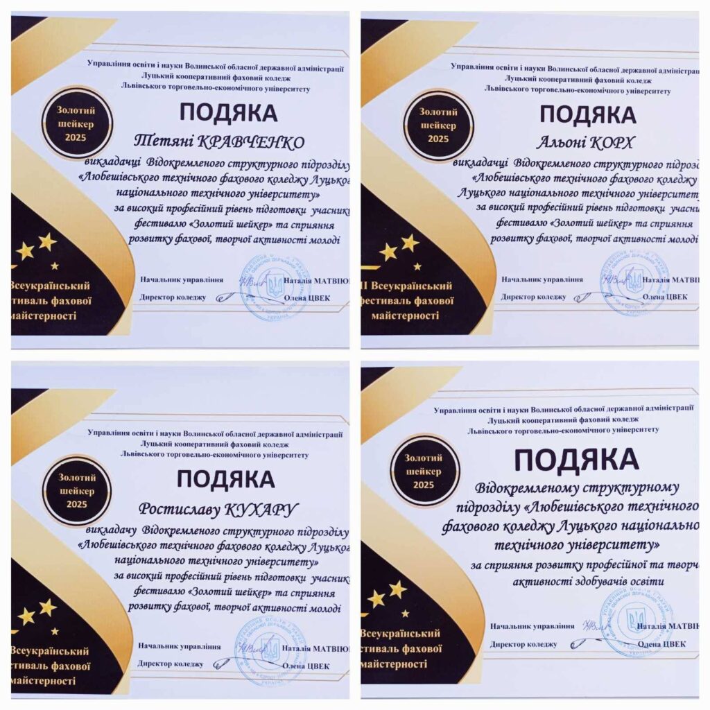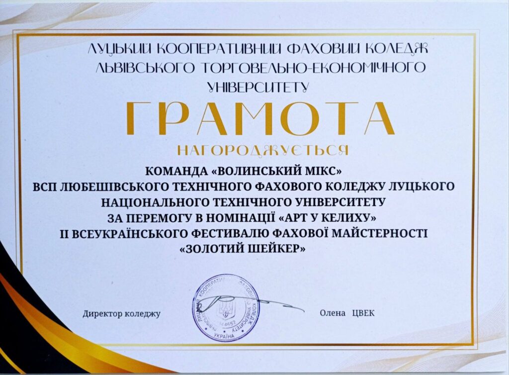 Команда “Волинський мікс” ВСП “Любешівський ТФК ЛНТУ” взяла участь у Всеукраїнському фестивалі фахової майстерності “Золотий шейкер”. Захід відбувся в онлайн режимі на базі Луцького кооперативного фохового коледжу ЛТЕУ.