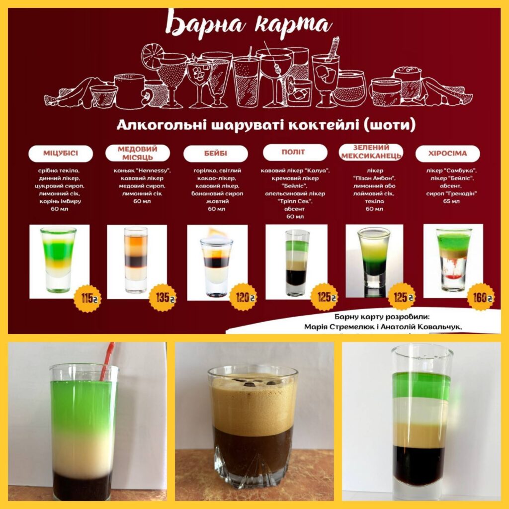 На конкурс були представлені роботи: відео приготування безалкогольного коктейлю “Фруктовий експрес” за власною рецептурою, алкогольного шаруватого коктейлю “Політ” і кавового фраппе, а також барна карта і технологічні карти напоїв.